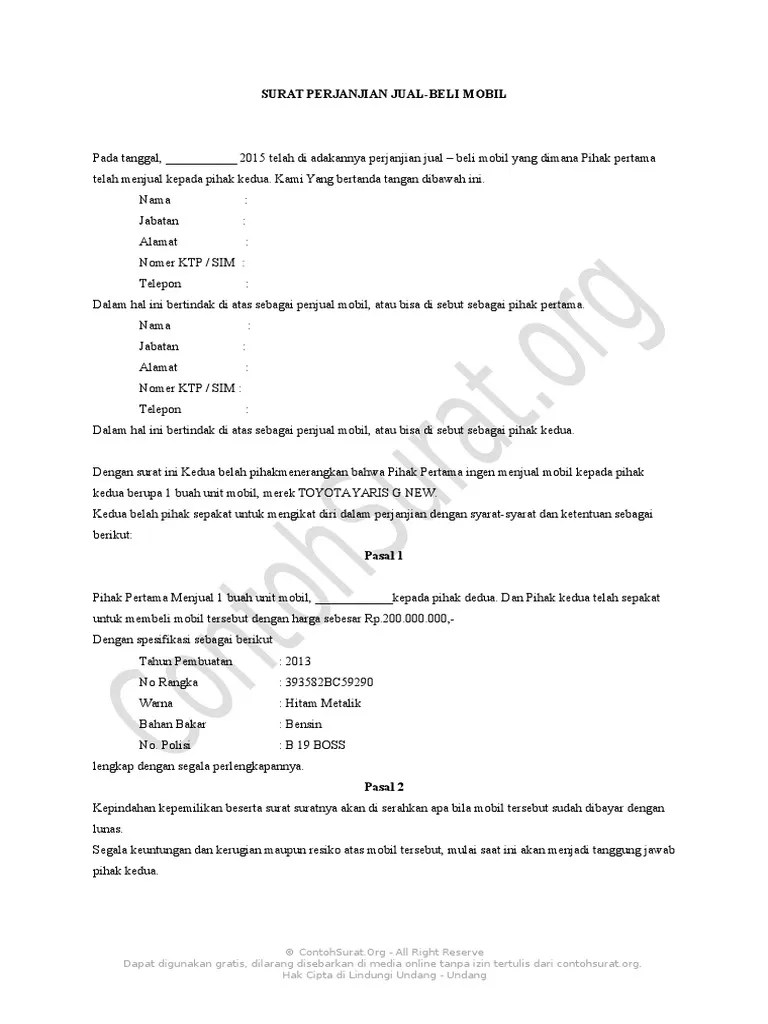 Informasi yang harus ada dalam surat perjanjian jual beli mobil · identitas dan data diri dari pihak pertama (penjual mobil). Selain untuk menguatkan bukti transaksi, . Indonesia mengenal surat perjanjian jual beli mobil atau akta jual beli mobil sebagai tanda bukti yang sah terkait transaksi jual beli yang . Surat perjanjian jual beli mobil pada hari ini.